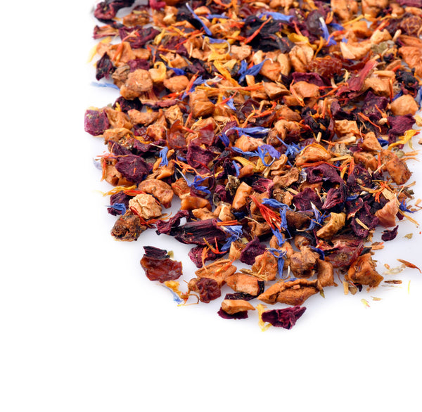 Apple pieces, hibiscus, beetroot pieces, rosehip, liquorice root, marigold petals, safflower petals, cornflower petals, blackberry leaves, stevia leaves, blueberry cake flavour and Irish cream flavour