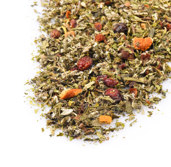 Rosehip, moringa leaves, lemon balm leaves, sencha green tea, raspberry leaves, sage leaves, nettle leaves, cardamom, lemon peel, orange peel, acerola pieces & natural flavouring.