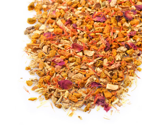 Turmeric, ginger, liqourice, safflower, rose petals & orange peel